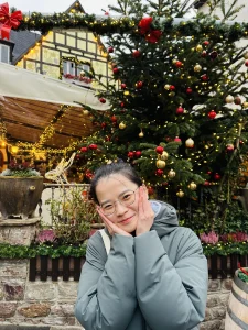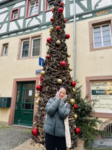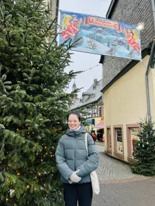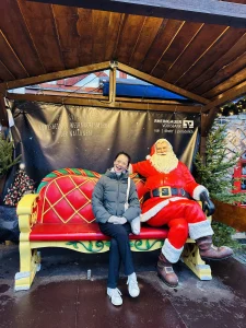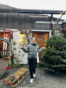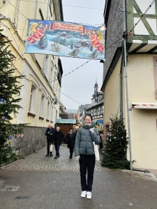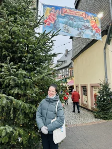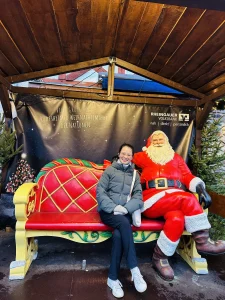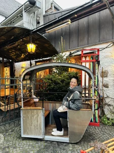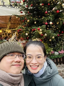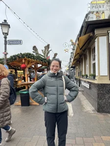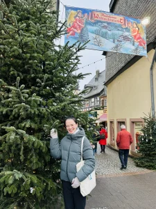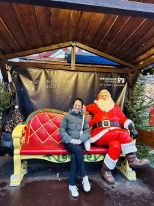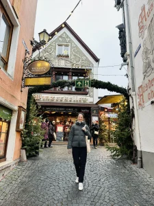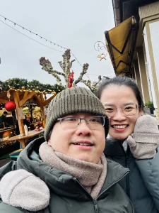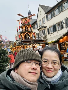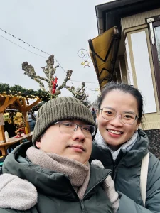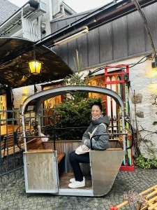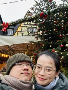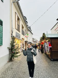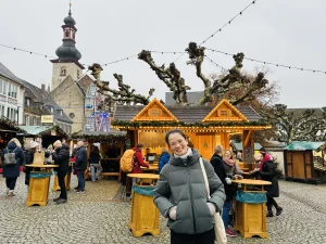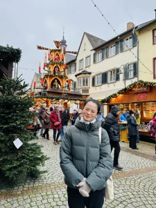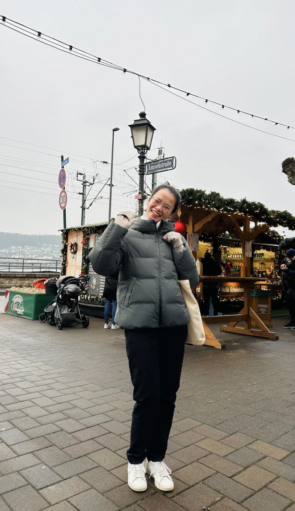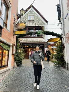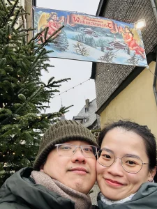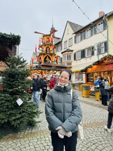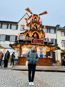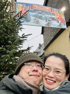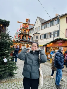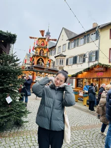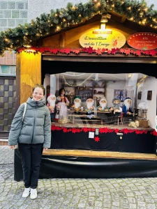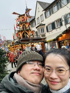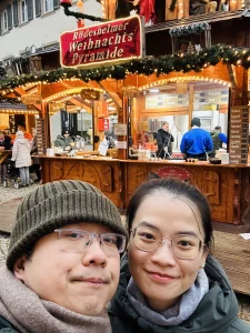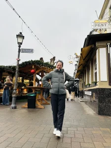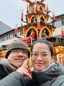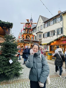 Tuy nhiên, khi đi một vòng quanh chợ để tìm đồ ăn, mình nhận thấy quầy bán đồ ăn khá ít — chưa đến 10 quầy trong tổng số hơn 80 gian hàng. Xem qua giá cả thì thấy mỗi món mắc hơn khoảng 1€ so với các chợ ở nơi khác, nên mình cũng không hào hứng lắm. Cuối cùng, hai đứa chỉ uống Glühwein và Kinderpunsch rồi ra về. Sau một chuyến đi dài thì thu về được kha khá hình kỉ niệm nên cũng vui hihi 😊.