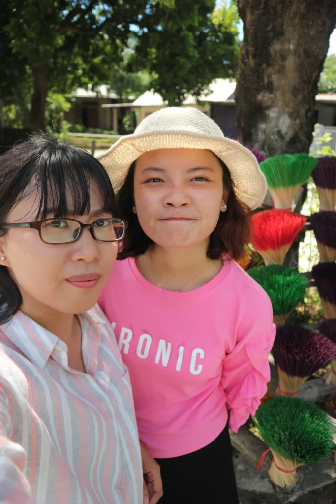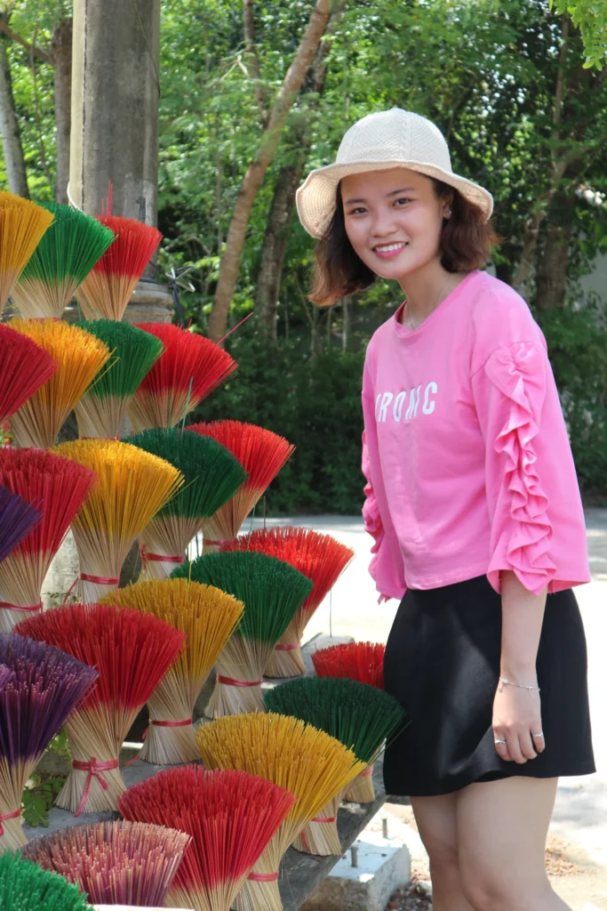 Trên đường đi mình có ghé qua làng nghề Thủy Xuân, là một điểm đến vô cùng thú vị cho những ai yêu thích chụp ảnh. Thủy Xuân với nghề làm hương nổi tiếng từ hơn hàng trăm năm qua. Những cây hương truyền thống sẽ có hai màu cơ bản là nâu và đỏ. Tuy nhiên, người thợ ở làng đã sáng tạo phối thành nhiều màu để sản phẩm thêm bắt mắt.
