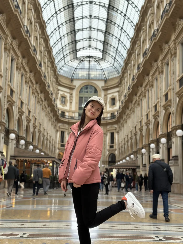 Chỗ hai đứa đang đứng là Galleria Vittorio Emanuele II. Có thể nói, đây chính là trung tâm mua sắm lâu đời nhất tại Milano được xây dựng từ năm 1865 tới năm 1877. Công trình này có rất nhiều điểm khác biệt với các trung tâm thương mại thông thường bởi nó lộng lẫy như một cung điện cổ tích, sang trọng và đầy tinh tế. Lối vào từ quảng trường được trang trí hình vòm lộng lẫy, gây ấn tượng thị giác mạnh mẽ ngay từ khi bước vào. Bên trong khu phố mua sắm, bạn có thể nhìn thấy hàng trăm cửa hiệu bày bán các mặt hàng khác nhau: thời trang, trang sức, cà phê… hay thậm chí là các quán bar.