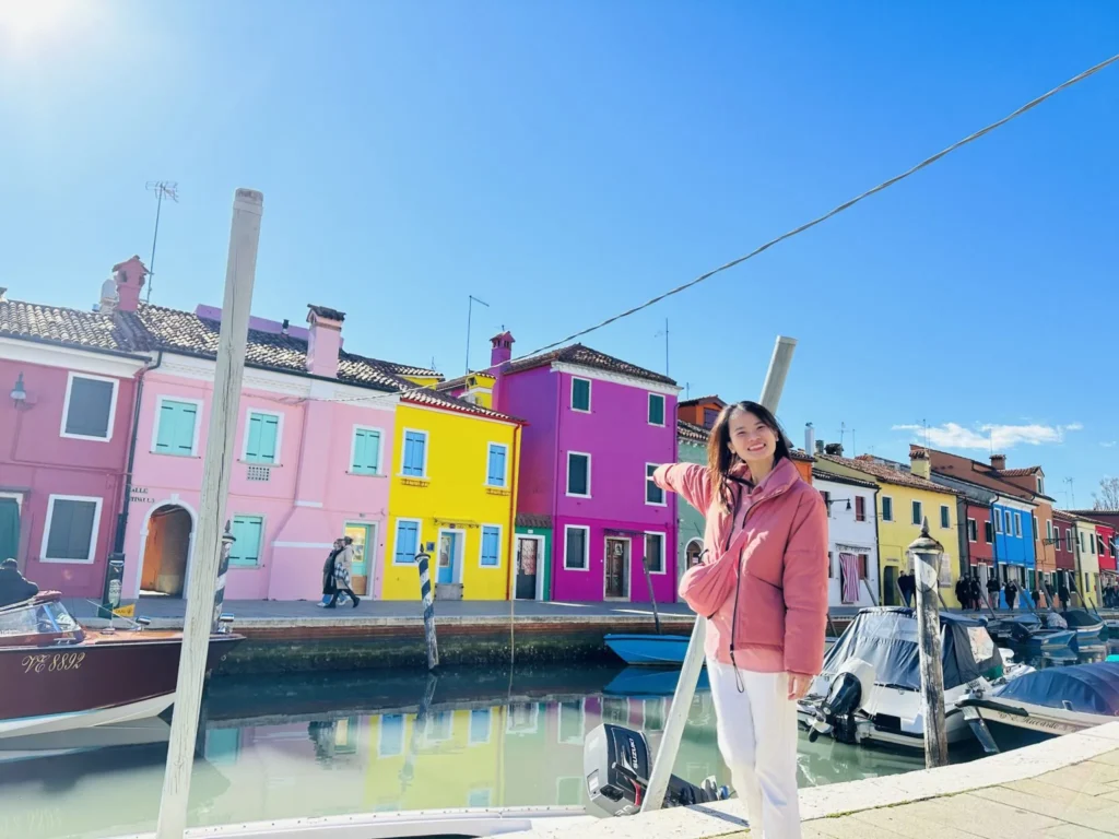 Bọn mình đi đến Venice và đảo Burano. Đảo Burano cách Venice 10km về phía đông. Thời gian di chuyển từ Venice đến đảo cả đi và về mất gần 3 tiếng. Nếu Venice có vẻ đẹp cổ điển và đầy chất thơ thì Burano lại rực sỡ đầy màu sắc.