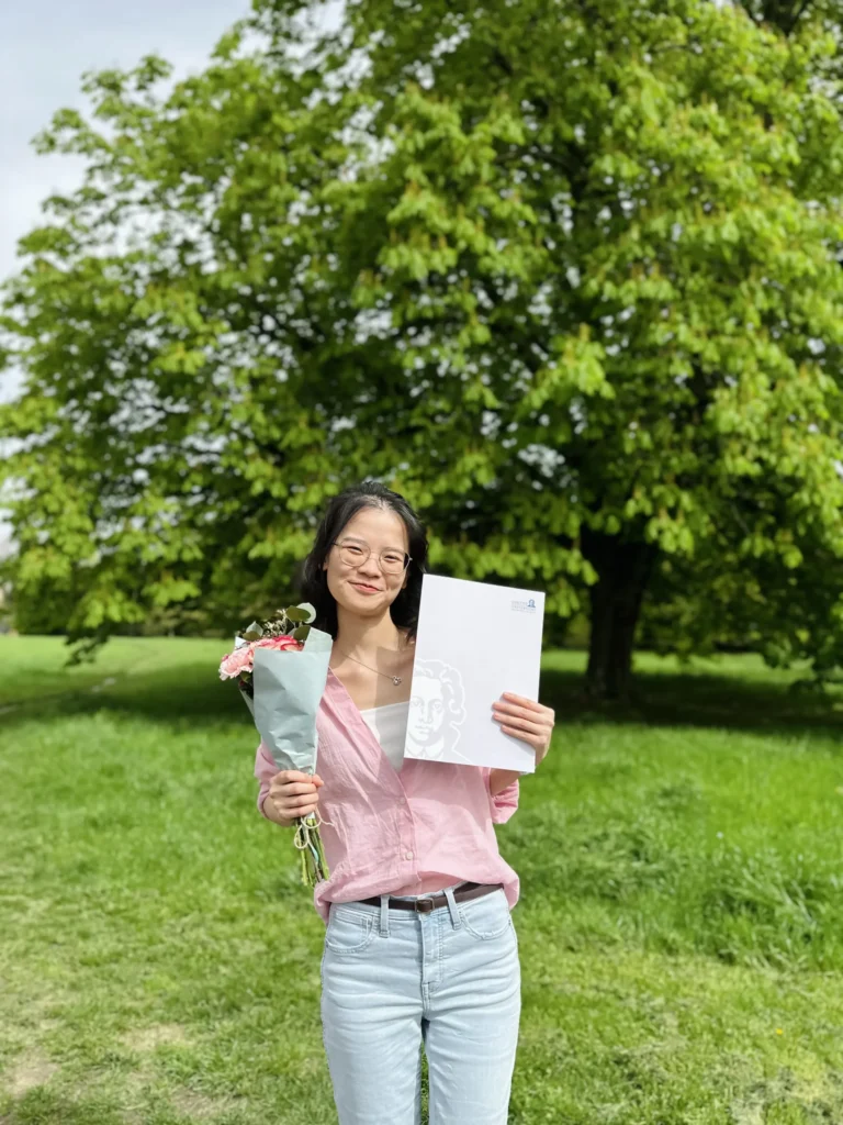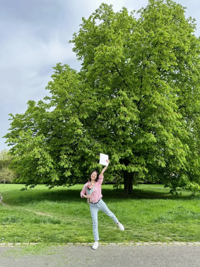 Anh Linh có mua tặng cho mình một bó hoa màu hồng dễ thương cùng tone màu với outfit hồng của hai đứa. Hai đứa chưa ai ăn sáng, chưa ăn trưa luôn, đi từ cổng sau cho đến cổng trước để chụp hình kỉ niệm. Dường như, những bức hình ấy không chỉ ghi lại khoảnh khắc, mà còn là cách mà mình lưu giữ kỷ niệm về một ngày đặc biệt – ngày đánh dấu sự trưởng thành và bước vào một chương mới của cuộc đời.