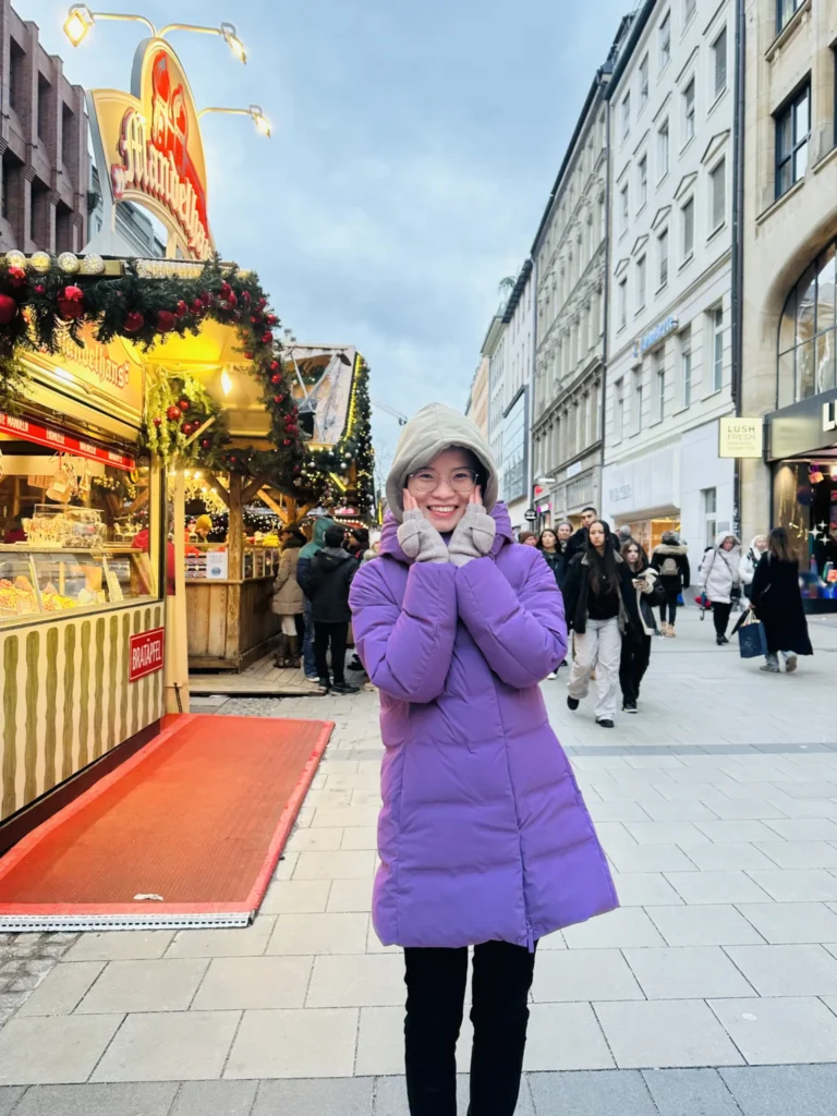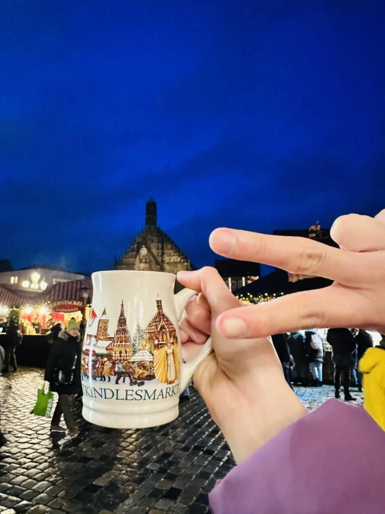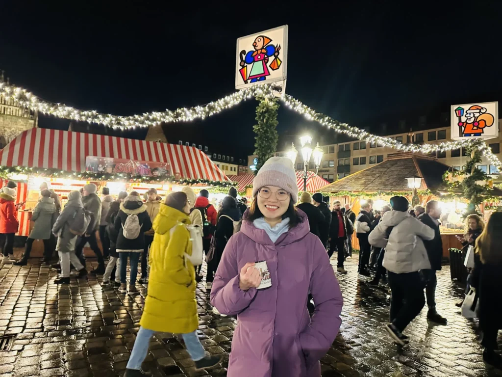 Nürnberg là thành phố thu hút khách du lịch nhất Đức khi bước vào mùa Giáng sinh với khoảng 2 triệu du khách mỗi dịp lễ. Hôm nay có mưa nhẹ nên mình cũng không chụp hình nhiều kkk, với đói quá nên vừa mua xong là quất luôn, quên chụp hình đồ ăn. Đồ ăn ở chợ Giáng sinh Nürnberg cũng giống những chợ khác ở đức như là Glühwein, bánh Crepes, bánh mì xúc xích, các loại hạt rang… Đặc biệt ở đây nổi tiếng xúc xích nướng Nürnberg, món yêu thích của mình mỗi lần đi siêu thị hehe.