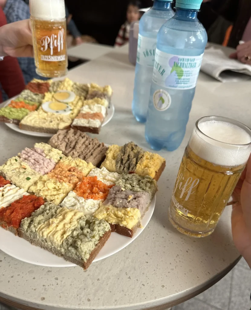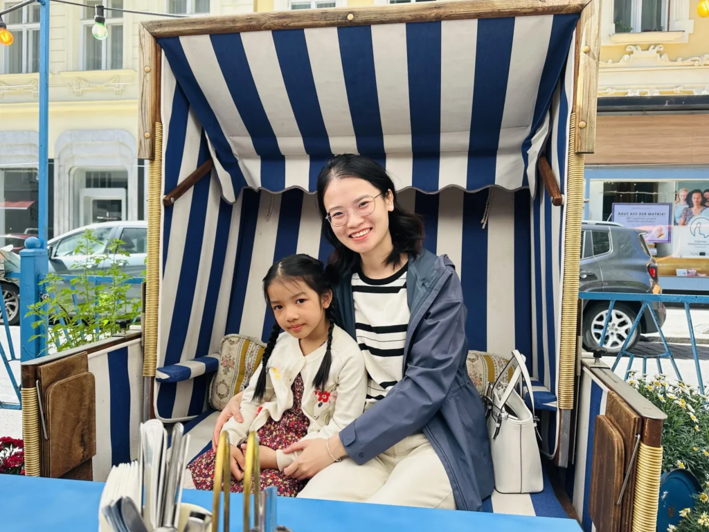 27.04.2024, mình và anh Linh bay từ Frankfurt đến Wien (Vienna). Gia đình chị Mây thì bay từ Bỉ đến Wien. Khoảng 12:30 mình có mặt tại sân bay Wien. Cùng lúc đó thì gia đình chị Mây cũng vừa mới đến sân bay. Sau đó mình đi đến công ty thuê xe để nhận xe. Điểm đến đầu tiên là một quán ăn ở ngay trung tâm Wien. Một tiệm bán bánh mì rất ư là dễ thương và đầy màu sắc, cái gì cũng bé tẹo teo, may là ăn ngon hehe. Ly bia thì bé tí nằm gọn trong lòng bàn tay 🤣.