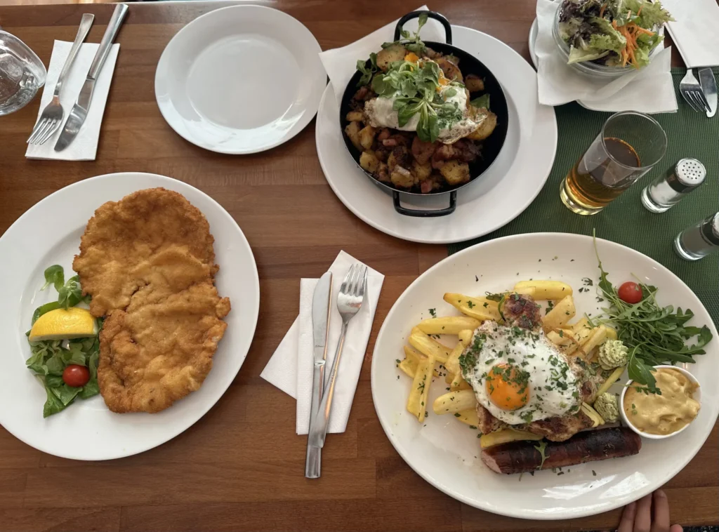 Đây là những món mình đã chọn: Wiener Schnitzel (thịt heo chiên giòn), Goulasch (Bò hầm ăn kèm với mì), Tiroler Gröstl (Khoai tây, hành tím, thịt, xúc xích và trứng chiên) và Xúc xích. Tráng miệng gồm có Apfelstrudel (bánh táo) và Kaiserschmarrn (kiểu như bánh bông lan ăn kèm mứt).