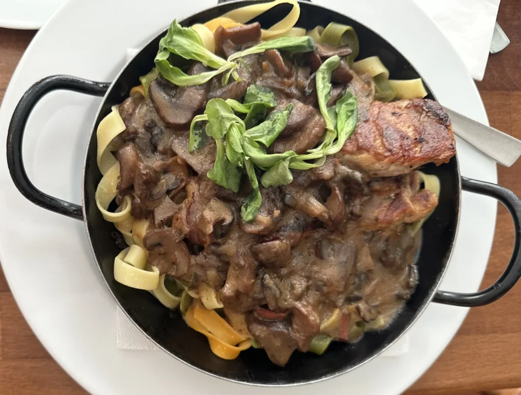Bây giờ mình cần nạp năng lượng cho hành trình tiếp theo 😉. Mình chọn nhà hàng “Der Bettelstudent” có bán những món truyền thống ở Áo để ăn thử. Ta nói bụng thì đói rả rời do đi cái cung điện to vật kia, đến nơi chờ đồ ăn hơn 45 phút, muốn xĩu ở cái bàn ăn luôn 😅. Mà may là đồ ăn ngon nên tạm tha thứ cho sự chậm trễ khi lên món.