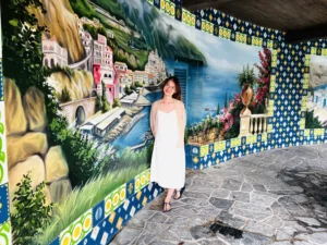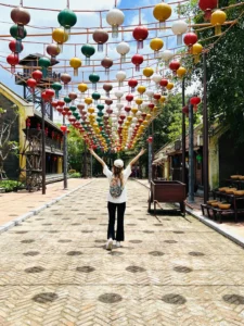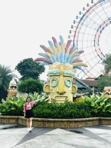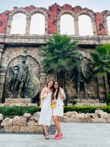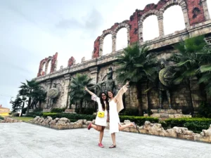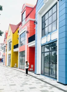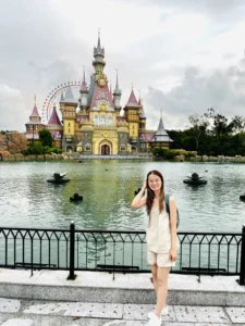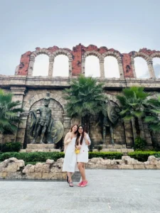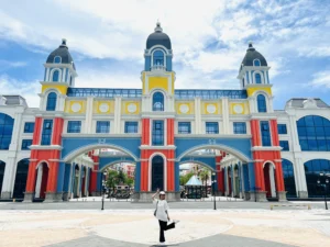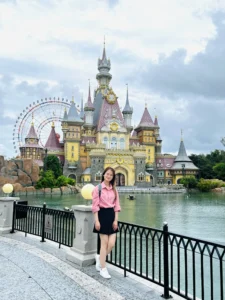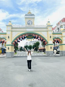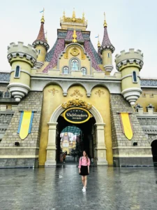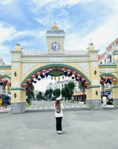 Khi bước vào cổng mình bắt gặp đầu tiên là đại lộ châu Âu. Phía xa xa là một toà lâu đài mình thấy nó giống kiểu lâu đài màu hồng trong công viên Disneyland Paris. Mình khá là thích màu sắc sặc sỡ, mà ở đây mọi thứ đều chỉ là mô phỏng theo kiến trúc châu Âu nhưng nó sặc sợ lắm nha. Nên đi được 5 bước chân là mình chụp vài tấm hình kkk. Không nói người ta tưởng mình dưới vùng quê xa xôi hẻo lánh được đi chơi lần đầu, chứ không phải là mới từ đức về. 😁